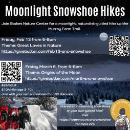 Stokes Nature Center is hosting a moonlight snowshoe event to learn about the origins of the moon on a guided hike up the Murray Farm Trail in Wellsville on Friday March 6th at 6:00 p.m. Please dress warm for the evening and arrive a little before 6pm to test your winter gear and meet your instructor.